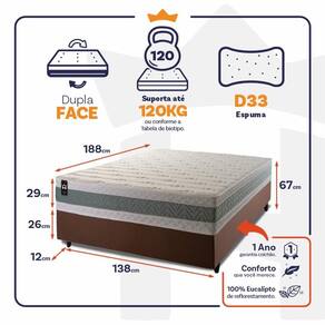- Altura: 29 cm (colchão) + 26 cm (box) + 12 cm (pés) = 67 cm de altura;