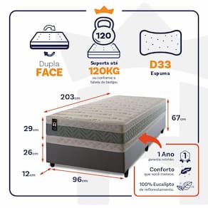 - Altura: 29 cm (colchão) + 26 cm (box) + 12 cm (pés) = 67 cm de altura;