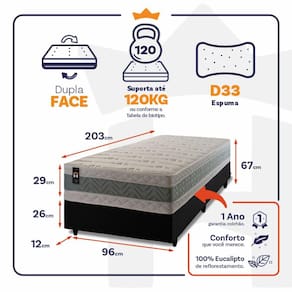 Medidas do Colchão: 88x188x29 cm, 96X203x29 cm, 128x188x29 cm,138x188x29 cm, 158x198x29 cm, 193x203x29 cm.