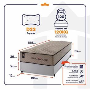 Feito com os mais nobres materiais em sua composição, ele conta com espuma D33 . O colchão King House acomoda melhor o contorno do corpo, dispondo de forma correta quadris e ombros, expulsando as dores e problemas de coluna.