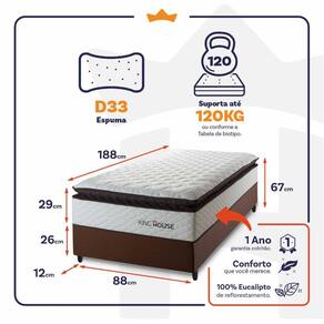 Feito com os mais nobres materiais em sua composição, ele conta com espuma D33 . O colchão King House acomoda melhor o contorno do corpo, dispondo de forma correta quadris e ombros, expulsando as dores e problemas de coluna.