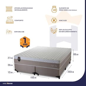 Feito com os mais nobres materiais em sua composição, ele conta com espuma D28 e molas ensacadas. Por ser mais macio, o colchão de molas ensacadas individualmente traz benefícios e ajuda no alinhamento da coluna. O colchão King House acomoda melhor o contorno do corpo, dispondo de forma correta quadris e ombros, expulsando as dores e problemas de coluna.