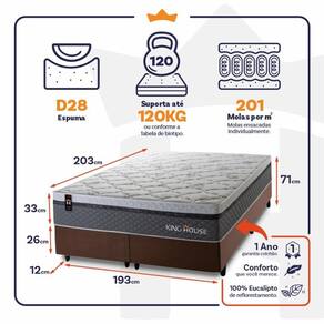 - Altura: 33 cm (colchão) + 26 cm (box) + 12 cm (pés) = 71 cm de altura;