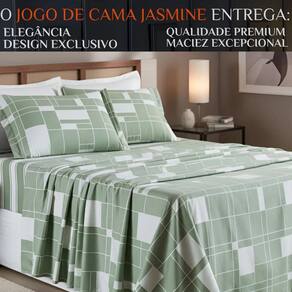 O conjunto jasmine acompanha 04 peças: 01 lençol com elástico, 01 lençol superior e 02 fronhas bordadas com acabamento premium.
