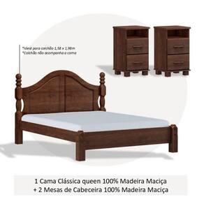 Este combo inclui uma cama queen clássica em madeira maciça de pinus com acabamento PU/UV na cor café, ideal para colchão de 1,58 × 1,98 m. A estrutura robusta e o design elegante garantem conforto e durabilidade, com capacidade para até 220 kg distribuídos. Acompanha duas mesas de cabeceira com gavetas espaçosas e nicho decorativo, perfeitas para organização. As gavetas possuem corrediças telescópicas, e os puxadores e pés são também em madeira maciça, reforçando o padrão de qualidade. Possui Portas: Não Possui Rodízio: Não Acompanha Colchão: Não Altura do Conjunto: 122.5 cm Ambiente: null Ambiente Principal: Quarto Cor: Café Informação Complementar: 2x Mesa de Cabeceira 2 Gavetas e Nicho 100% Madeira Maciça Linha Ouro Café Largura: 44 cm Altura: 69 cm Peso: 11,6 kg Profundidade: 38 cm Necessita Montagem: Sim