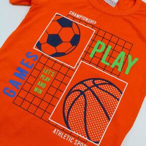 Camiseta Manga Curta Laranja: Confeccionada em meia malha 100% algodão, a camiseta laranja apresenta uma estampa divertida de futebol, trazendo um toque esportivo e alegre. O tecido leve e respirável proporciona conforto durante o uso, perfeito para as brincadeiras do dia a dia.