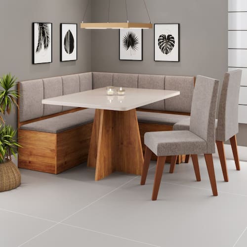 O conjunto canto baú Prestigio é uma solução inteligente para quem busca funcionalidade e beleza no mesmo ambiente, ideal também como divisor de espaços. A mesa possui base em MDP, tampo em MDF com vidro de 4mm e cantos arredondados, unindo segurança, durabilidade e sofisticação. O canto com baú embutido é perfeito para guardar objetos e manter tudo sempre organizado. Acompanha 2 cadeiras Milão produzidas em madeira maciça, garantindo resistência e firmeza. O assento das cadeiras conta com espuma D26, oferecendo o conforto ideal para refeições e momentos em família. O revestimento em tecido linho, presente tanto no canto quanto nas cadeiras, proporciona leveza, toque suave e um visual moderno ao conjunto. É uma escolha versátil que combina com diversos estilos de decoração. Ideal para cozinhas, salas de jantar ou espaços integrados. Um conjunto completo, elegante e funcional para transformar seu ambiente.