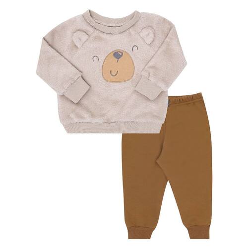Pensando em um look incrível para seu menininho a Pulla Bula trouxe esse conjuntinho super fofo, composto por um blusão com estampa bordada de ursinho, confeccionado em pelo na cor caqui e uma a calça lisa confeccionada em moletom na cor verde marrom castor. Um look confortável e cheio de charme, indispensável para esse inverno.