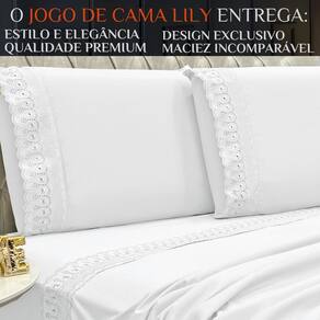 Imagine-se deitando em uma cama perfeita, digna de hotel 5 estrelas, com a suavidade do algodão de alta contagem de fios e o charme atemporal do bordado inglês. Esse jogo de cama foi feito para quem valoriza não apenas o conforto, mas também os pequenos detalhes que tornam o quarto um lugar acolhedor e cheio de estilo. O Lily 300 fios é aquele toque de carinho que você merece ao final de cada dia, proporcionando um descanso restaurador e momentos de puro aconchego.
