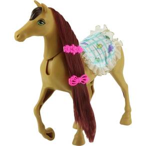 O conjunto inclui um cavalinho marrom e diversos acessórios, como sela, espelho, escova e presilha para diversificar as brincadeiras.
