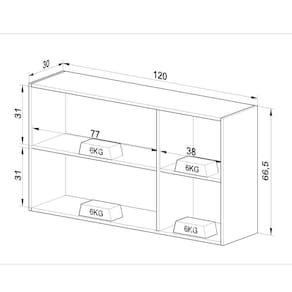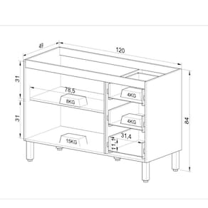 As dimensões estão expressas na seguinte forma - Largura x Altura e Profundidade em cm. O peso suportado considera a carga distribuída igualmente pela peça.