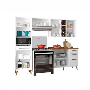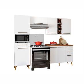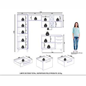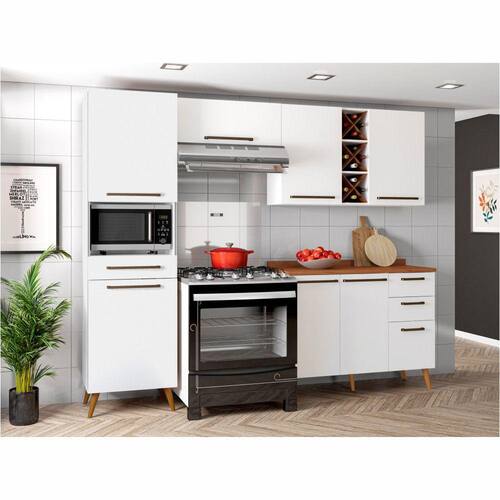 Contém amplo Paneleiro com espaço para micro-ondas, Balcão com três gavetas sendo um gavetão, Armário Aéreo com nicho garrafeiro para 12 unidades, o Armário Sobre Geladeira tem porta basculante com pistão a gás.