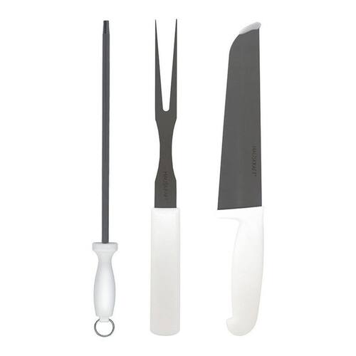 Kit churrasco conjunto faca + garfo + chaira hauskraft inox Conjunto de churrasco facile 3 peças - Dimensões da peça: Faca carne: 33 x 5 x 2,4cm Garfo: 31,5 x 3 x 2cm Chaira: 32,5 x 3,4 x 1,9cm - Dimensões da embalagem: 39 x 18 x 3,5cm - Material: aço inox, plástico - Cor do cabo: branco - Tipo de embalagem: cinta + caixa litografada - Marca: haüskraft Faca de carne: Versátil, esta faca é indicada para cortar e fatiar carnes, frutas legumes e peixes. Dica: facas com serrilha não são indicadas para cortar ou preparar carne, pois elas destrincham suas fibras, deixando-a com um aspecto horrível. Garfo trinchante: É indicado para servir ou cortar carnes assadas. Seus dentes longos facilitam na inserção de pedaços maiores de carne, além de prender a carne na posição correta, proporcionando mais segurança e precisão ao corte e aos movimentos da faca. Dica: lembre-se de sempre espetar a carne com cuidado, pois a cada inserção do garfo, a carne perde seu suco e consequentemente seu sabor. Chaira: Utilizado para manter a lâmina das facas afiadas e alinhadas. Recupera o fio da faca e proporciona maior eficiência ao corte. Dica: uma faca afiada além de facilitar o trabalho do churrasqueiro faz com que os pedaços fiquem muito mais bonitos para servir. Facas sem fio são mais perigosas do que as muito afiadas, é necessário fazer mais força durante os cortes, aumentando assim o risco de se ferir. Facas bem afiadas dispensam o uso da força, pois deslizam pelos alimentos com mais facilidade. - Recomendações: Mantenha sua faca sempre afiada e seca. Resistente ao uso em máquina de lavar. Produto cortante e perfurante. Mantenha fora do alcance das crianças. Ean: 7896980408249