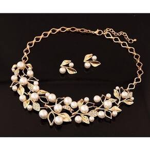 Conjunto de colar e brinco banhado a ouro com strass e pérolas sintéticas