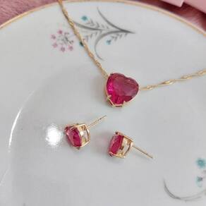 Este Conjunto Colar e Brinco Coração Pedra Vermelho Marsala é perfeito para quem busca uma joia elegante e sofisticada. O conjunto é banhado em ouro 18k, o que confere um brilho único e duradouro.