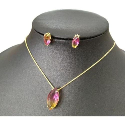 Este Conjunto Colar e Brinco é perfeito para adicionar um toque de elegância e sofisticação ao seu visual. Com banho em ouro 18k, essa semijoia possui pingente e brincos em formato navete, com pedras de zircônia rosa em um degradê encantador.