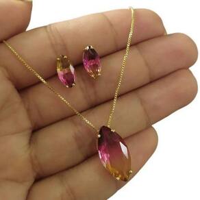 Conjunto Colar e Brinco Ouro 18k - Zircônia Rosa e Amarelo