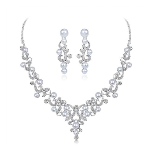 Conjunto de colar e brinco prateado com strass e pérolas sintéticas Ideal para casamentos, formaturas e festas em geral. Brinco com 4,0cm Colar com comprimento ajustável. Uma linda peça para ser Utilizado nas ocasiões mais importantes de sua vida. Incluso: 01 colar 01 Par de brincos Acompanham caixa de presente. Marca: Não Informado Ean: 7892042725279