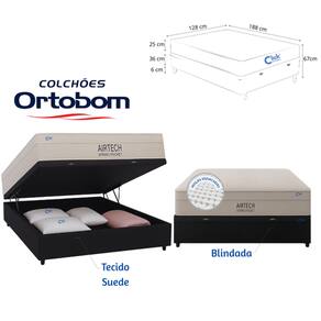 Conjunto Colchão Ortobom Airtech Viúva + Cama Box Baú Blindada 128x188 Este conjunto une conforto, praticidade e organização em um só produto. O Colchão Ortobom Airtech Viúva (128x188x25 cm) conta com molas ensacadas individuais, espuma D26 e placa de EPS, oferecendo maciez, suporte e maior durabilidade. Seu revestimento em tecido Jacquard com viscose é elegante, e o tratamento antiácaro e antialérgico garante noites de sono mais saudáveis. A Cama Box Baú Blindada Viúva Suede (128x188 cm) é resistente e funcional. Possui estrutura em madeira de Pinus, pistões a gás para abertura suave e espaço interno de 25 cm de profundidade para organização. Suporta até 300 kg distribuídos e acompanha pés reforçados e arco de apoio para o colchão.