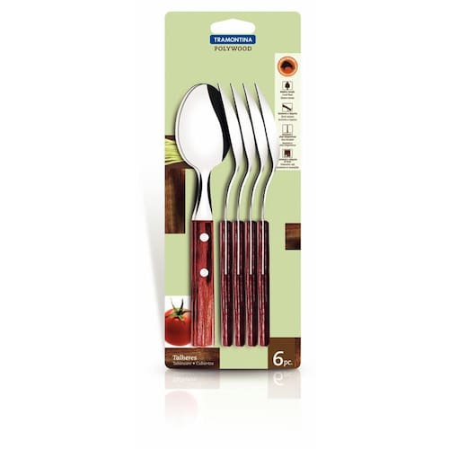 Conjunto Colheres Mesa 6 Peças Polywood Tramontina 21103670 As refeições informais não dispensam a qualidade dos talheres, utensílios e facas. Por isso, a Linha Polywood têm lâminas de aço inox em formato e espessura que garantem a resistência e evitam deformações. O tratamento térmico dá mais durabilidade ao fio e o cabo de madeira tratada polywood, fixado com rebites de alumínio, é confortável à pega. Com cinco anos de garantia, permanecem bonitos mesmo com uso intenso e submetidos a impactos e altas temperaturas. Podem ir à máquina de lavar louças.