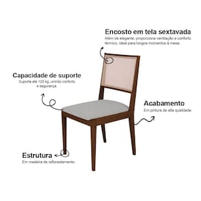 O assento conta com espuma de alta densidade D26, que oferece firmeza e conforto na medida certa, além de suportar até 120 kg com total segurança. O design com linhas retas e acabamento refinado permite que a cadeira se adapte facilmente a diferentes estilos de decoração, do clássico ao contemporâneo.