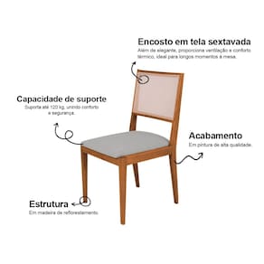 O assento conta com espuma de alta densidade D26, que oferece firmeza e conforto na medida certa, além de suportar até 120 kg com total segurança. O design com linhas retas e acabamento refinado permite que a cadeira se adapte facilmente a diferentes estilos de decoração, do clássico ao contemporâneo.