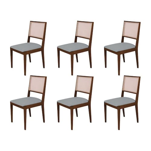 AS IMAGENS SÃO MERAMENTE ILUSTRATIVAS E PODEM SOFRER VARIAÇÕES DE COR E PEQUENOS DETALHES DE ACORDO COM O SEU MONITOR, ILUMINAÇÃO DO AMBIENTE E ATÉ MESMO A SUA PERCEPÇÃO VISUAL.Conjunto com 6 Cadeiras de Jantar Estofada Suellen Mel Linho Cinza