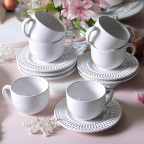 As xícaras de chá Roma trazem conforto no uso e o relevo característico da linha. Em faiança feldspática com esmaltado vitrificado, oferecem resistência e brilho duradouro. O Branco é versátil e coordena com pratos e tigelas da coleção. Compatíveis com micro-ondas e lava-louças. Variações leves de cor e medidas podem ocorrer. Limpeza simples com detergente neutro e esponja macia. Produzido no Brasil. Marca Porto Brasil Cerâmica Coleção Ravenna Linha Roma Branco Material Cerâmica Feldspática Cor Predominante da Base Branco Composição 6 Xícaras de Chá e 6 Pires de Chá Dimensões do Produto Xícara de Chá Ø 8cm A = 6cm V = 161ml/ Pires de Chá Ø 14cm A = 2cm