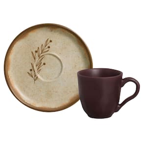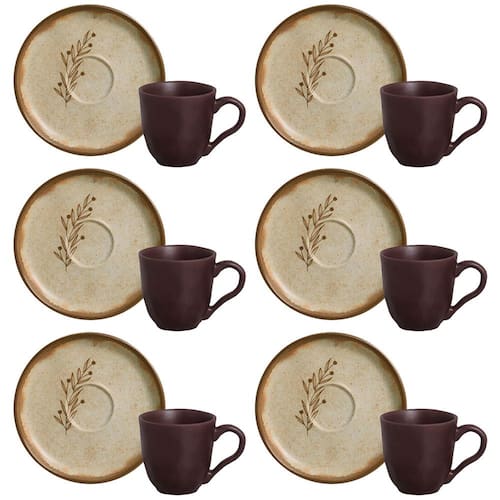 Aqui, temos um conjunto com 6 xícaras e pires para café, totalizando 12 peças. Produzidas a uma temperatura média de 900°C, cada uma das xícaras possui capacidade para até 120 ml, além de terem acabamento esmaltado.