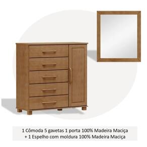 Este combo é composto por uma cômoda com 5 gavetas e 1 porta , fabricada em madeira maciça de pinus reflorestado, com acabamento em verniz PU/UV na cor Freijó. Possui corrediças telescópicas, dobradiças com amortecimento e prateleiras internas. Já o espelho é um móvel complementar da mesma linha, com estrutura robusta e design clássico, ideal para compor ambientes sofisticados com funcionalidade e elegância. Juntos, formam um combo cheio de estilo. Possui Portas: Sim Suporta Até (kg): 30 kg Possui Rodízio: Não Altura do Conjunto: 124 cm Ambiente: null Ambiente Principal: Quarto Cor: Freijó Informação Complementar: 1x Cômoda 5 Gavetas 1 Porta 100% Madeira Maciça Linha Ouro Freijó Largura: 125 cm Altura: 124 cm Peso: 47,2 kg Profundidade: 49 cm Necessita Montagem: Sim