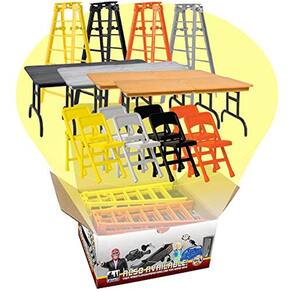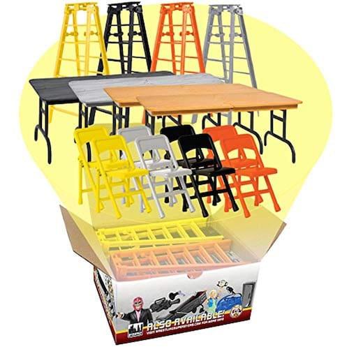 Conjunto completo de todos os 4 Playsets de Prata ULTIMATE Ladder, Table & Chairs. Inclui 4 escadas, 4 mesas quebráveis e 8 cadeiras dobráveis! Isso vai muito bem com todas as suas figuras de ação de wrestling atuais e passadas.