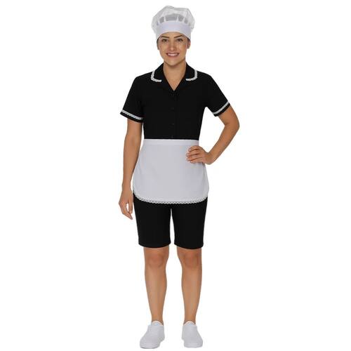 Esse uniforme operacional tem como objetivo proteger o vestido e deixar a trabalhadora mais elegante.