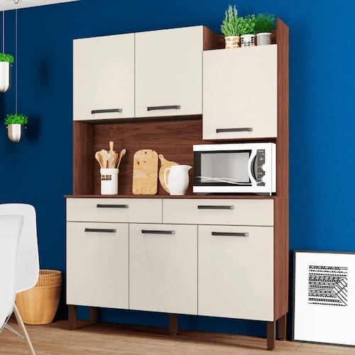 O Kit Cozinha irá se tornar o charme de sua cozinha, seu design diferenciado dispõe de um nicho para decoração superior podendo ser utilizado para vasos, flores e outros. Tem a sua disposição de um grande espaço para Eltrodomésticos podendo acomodar um micro-ondas, sua matéria prima valoriza o meio ambiente sendo feita de madeira de reflorestamento.