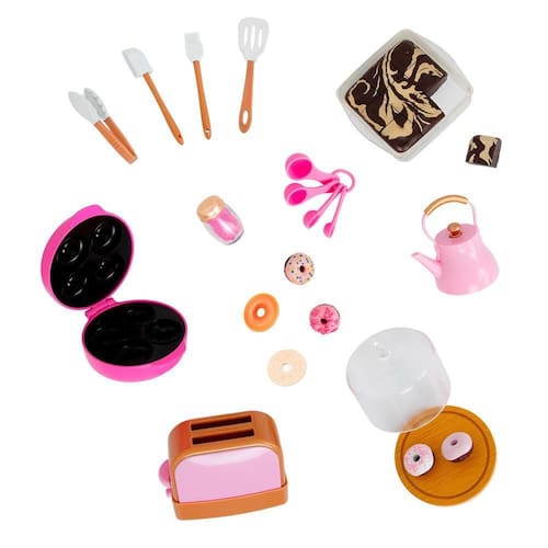 Além disso, o Conjunto de Cozinha com Chaleira - Our Generation vem com diversos acessórios, como uma espátula, colheres medidoras, pincel e pote de granulado. Com eles, suas bonecas podem preparar sobremesas deliciosas e surpreender os convidados. A bandeja de brownie possui uma peça removível, facilitando na hora de servir. E a máquina de donuts faz quatro donuts coloridos que cabem perfeitamente na bandeja de sobremesas.