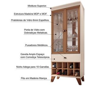 Detalhes da Cristaleira: Nicho Adega para 10 GarrafasPrateleiras da Cristaleira: 02 de Vidro 6mm EspelhosPuxadores da Cristaleira: 03 com Acabamento MetálicoGavetas da Cristaleira: 01 com Amplo Espaço e Corrediça TelescópicaPortas da Cristaleira: 02 de Vidro com Moldura Superior e Dobradiças Metálicas