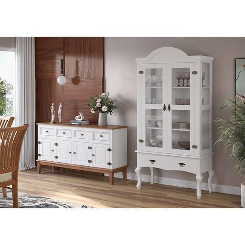 Beleza e Elegância: O design clássico da Cristaleira Luis XV e a robustez do Balcão de Madeira Maciça 4 Portas e 4 Gavetas conferem um toque de sofisticação a qualquer ambiente.