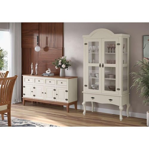 Beleza e Elegância: O design clássico da Cristaleira Luis XV e a robustez do Balcão de Madeira Maciça 4 Portas e 4 Gavetas conferem um toque de sofisticação a qualquer ambiente.