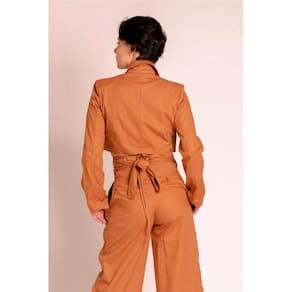 Conjunto Cropped Calça Jaque, a blusa possui mangas longas com ombreiras, detalhe de sobreposição que lembra um colete, possui bolsos duplos e falsos. Decote em V com lapela e cordas do mesmo tecido para amarração. Calça de cintura alta com fechamento frontal em zíper e bolsos laterais. O conjunto do cropped de manga longa e a calça de cintura alta é elegante e versátil, além de dar a impressão de que o corpo é mais alto e esbelto. Código do Produto: 2100002016585 Marca: Khalli