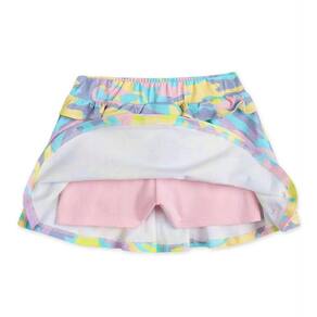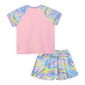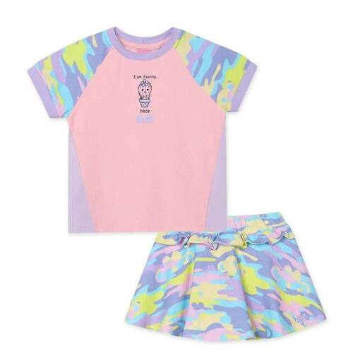 Conjunto Lilica composto por blusa e saia com short interno em meia malha stretch. A blusa possui mangas curtas em modelo raglan e com estampa camuflada, punho em cor contraste na manga, recortes frontais em cor contraste e estampa frontal com um cacto superfofo. A saia possui elástico no cós, short interno, estampa camuflada em toda a peça e detalhe com babados. Além disso, a saia conta com modelagem evasê e o look possui processo aplicado ao tecido com nanocápsulas de citronela.