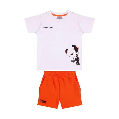 Estilo, conforto e diversão em dose dupla! Este conjunto exclusivo da Tigor T. Tigre é composto por uma blusa em meia malha leve e macia, com uma estampa localizada que traz o carisma inconfundível do Tigor, garantindo um visual alegre e cheio de personalidade. A bermuda, confeccionada em moletom sarjado de toque suave e estrutura firme, proporciona conforto absoluto e liberdade para as aventuras do dia a dia. O cós com elástico fora a fora facilita o vestir, enquanto os bolsos frontais oferecem praticidade. Para completar, uma estampa do Tigor T. Tigre reforça o charme e a autenticidade da peça.