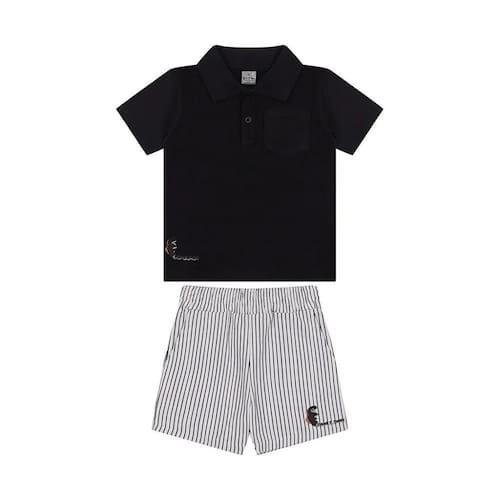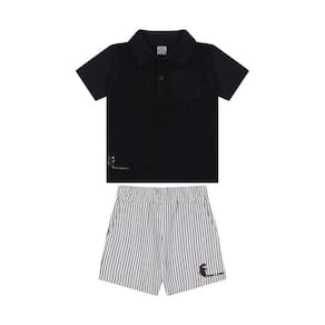 Estilo e conforto em dose dupla para os pequenos aventureiros! Este conjunto exclusivo da Tigor T. Tigre é composto por uma camisa gola polo confeccionada em meia malha stretch, que garante liberdade de movimento e maciez incomparável. O modelo conta com fecho de botões, bolso funcional e uma charmosa estampa localizada que traduz a personalidade autêntica da marca. A bermuda, com cós elástico confortável, apresenta bolsos práticos e uma estampa digital em listras modernas, complementada por uma estampa localizada do icônico Tigor T. Tigre o toque final de estilo que não pode faltar!