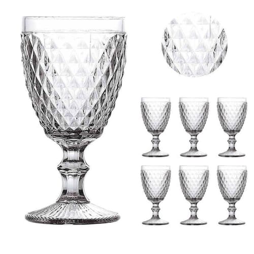 Conjunto de 06 Copos de Vidro 325ml Taça Bico de Abacaxi Conjunto de 06 Copos de Vidro 325ml Taça Bico de Abacaxi ===================================== Este conjunto elegante é composto por 6 taças produzidas em vidro de alta qualidade, com acabamento em relevo no clássico estilo bico de abacaxi.