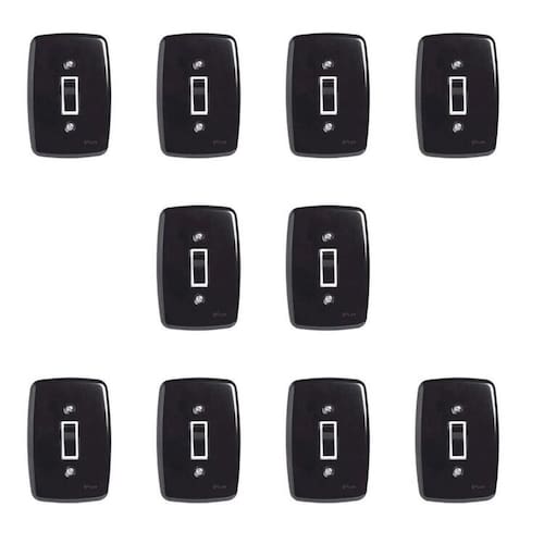 Com design retro esse conjunto é utilizado para o acionamento manual da iluminação (liga/desliga) em diversos ambientes residenciais, comerciais ou industriais. As placas e teclas são produzidos em ABS e com tratamento anti-UV garantindo a cor e o brilho por muito mais tempo. Altura do Conjunto: 12.5 cm Ambiente: null Ambiente Principal: Sala de Estar Cor: Preto Cor Predominante: Preto Garantia do Fornecedor: 5 anos Informação Complementar: 10x Interruptor de 1 Tecla Simples com Placa 4x2 Preto Largura: 8.5 Altura: 12.5 Peso: 0.034
