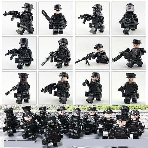 PRODUTO INTERNACIONAL - Conjunto com 12 Mini Figuras de Policiais SWAT Pretos em Blocos de Montar. A cor enviada será baseada na imagem principal da página do produto. Essas figuras são personalizadas e feitas de plástico ABS, totalmente seguro para crianças. Compatível com todos os principais blocos de construção.