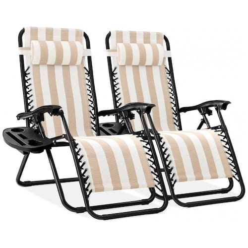 Desfrute do máximo de conforto com o Conjunto de 2 Cadeiras Reclináveis de Aço da Best Choice Products. Com um sistema de reclinagem travável que desliza suavemente para a posição ergonômica de gravidade zero, essas cadeiras oferecem ajuste imediato ao peso do seu corpo. Leves e dobráveis, são ideais para levar para o parque, praia ou eventos esportivos. As bandejas removíveis possuem dois porta-copos, um suporte para telefone e outro para tablet, garantindo que você tenha suas bebidas e dispositivos sempre ao alcance. Construídas com capacidade para até 113 kg, tecido textilene durável e encostos de cabeça ajustáveis e removíveis, proporcionam conforto personalizado. Dimensões abertas: 82.55cm x 63.5cm x 85.1cm. Dimensões dobradas: 96.5cm x 63.5cm x 15.2cm. Peso suportado: 113kg.