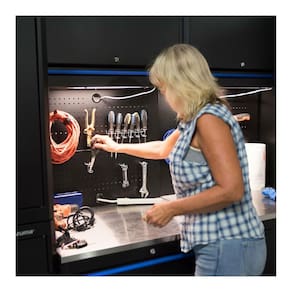 - Pendure suas ferramentas para facilitar o acesso: este ou 4 gavetas com bancada de aço inoxidável (BKMG30244BC) e armário de parede de 2 portas (BKMG30202WC) ou armário de parede de 1 porta (BKMG30201WC)