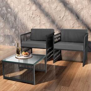 Conjunto De 2 Poltronas E Mesa De Centro Quadrada Com Tampo Preto/cinza Desfrute do conforto e versatilidade do Conjunto Santiago! O Conjunto Santiago possui um designer moderno e leve, que compoe qualquer ambiente. Composto por duas poltronas e uma mesa de centro, fabricadas em Aco Carbono, oferecendo resistencia ao sol, dando mais Durabilidade. Com acabamento em Corda Nautica, que confere uma estetica refinada, adaptando a diversos estilos de decoracao. Os assentos das poltronas sao estofados com material Impermeavel e espuma D28 no estofamento proporciona um conforto excepcional, enquanto a mesa conta com um tampo de vidro, que adiciona um toque de modernidade, oferecendo uma combinacao unica de estilo e conforto. ESPECIFICACOES TECNICAS: - Material: Aco Carbono; - Material do Assento: Espuma D28; - Material do Encosto: Espuma D28; - Acabamento: Corda Nautica; - Impermeavel: Sim; - Possui Tampo? Sim; - Possui Vidro? Sim; - Quantidade de Poltrona: 02; - Quantidade de Mesas de Centro: 01; - Produto Precisa de Montagem? (Sim/Nao): Nao; - Peso Total Suportado: 150kg; - Garantia: 3 Meses; - Instrucoes de Cuidado: Limpar com pano umedecido e sabao neutro; - Dimensoes do Produto (LarguraXProfundidadeXAltura) Mesa: 60x60cm / Poltrona: 60x73x65cm; - Conteudo da Embalagem: (01 Mesa de Centro, 02 Poltronas). Marca: Kit Home