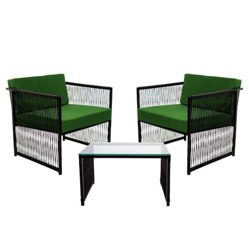 Conjunto De 2 Poltronas Em Fibra Sintética E Mesa De Centro Verde O Conjunto de 2 Poltronas Santiago e Mesa de Centro e perfeita para transformar qualquer ambiente em um espaco acolhedor e sofisticado. Composto por duas poltronas e uma mesa de centro, com um tampo de vidro de 60x60, proporcionando um toque moderno e pratico. As poltronas e a mesa de centro sao confeccionados com estrutura em Aco Carbono, oferecendo robustez e durabilidade. Com acabamento em Fibra Sintetica confere uma estetica refinada, destacando-se pela sua resistencia e versatilidade em se adaptar a diversos estilos de decoracao. Os assentos das poltronas sao estofados com material Impermeavel e espuma D28 no estofamento proporciona um conforto excepcional. Este conjunto oferece uma combinacao unica de estilo, conforto e durabilidade.