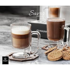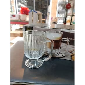 Conjunto de canecas de vidro para café ou cappuccino, que são vendidas em kits de 6 peças e têm um design canelado e elegante. As canecas são ideais para servir bebidas quentes ou frias.