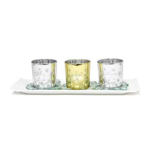 Conjunto de 3 velas de vidro Elegant Designs HG5000-SAG Christmas Décor Winter Wonderland Decoration com bandeja e miçangas, Let it Snow Believe prateado e dourado